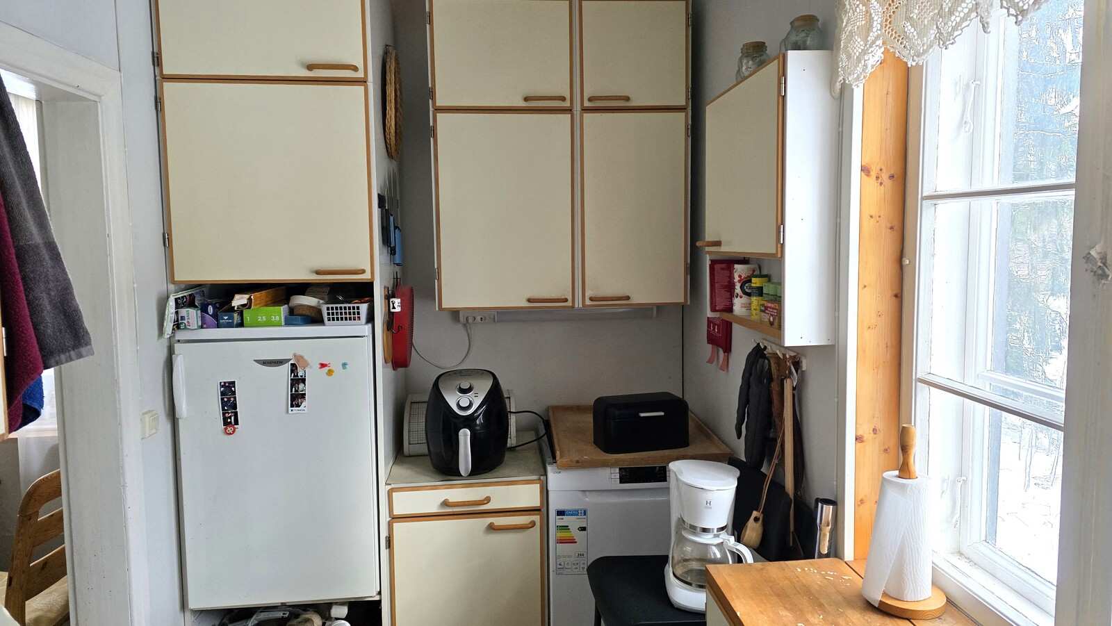 | Keittiön varustus | Jääkaappi ja pakastin: jääkaappi Muut varusteet: astianpesukone Seinät: maalattu Lattia: lauta Liesi/uuni: sähköliesi |