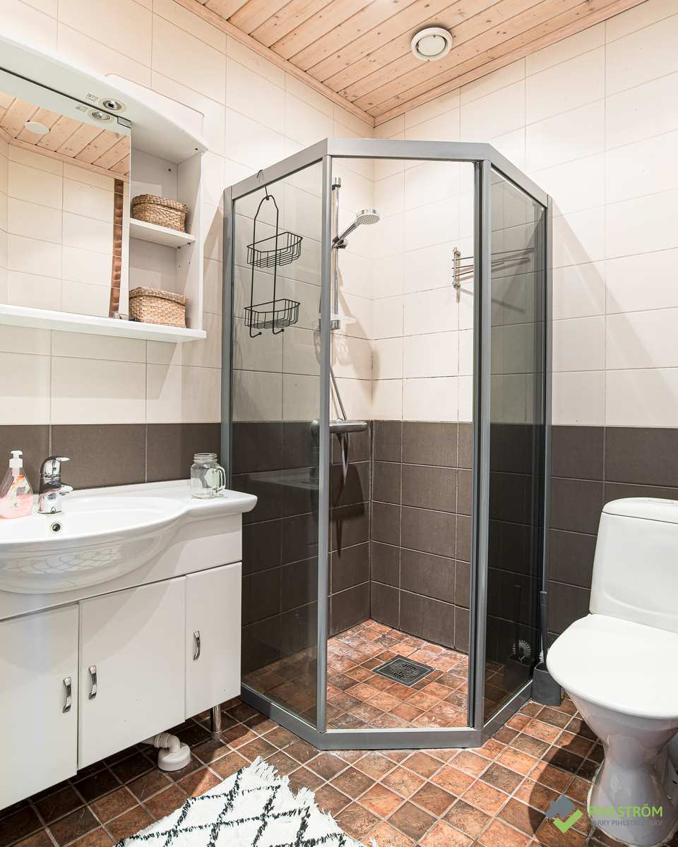 | Erillinen WC | Tilava erillis-wc, jossa myös suihku, sekä toinen wc kph:n vieressä. Lattia: laatta Seinät: kaakeli Lukumäärä: 2 |