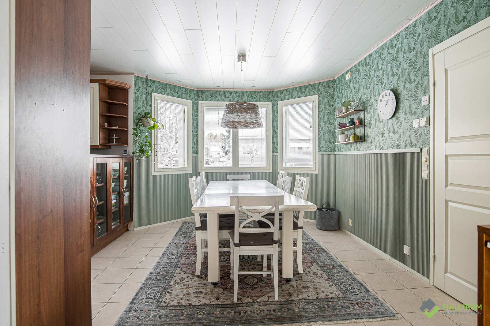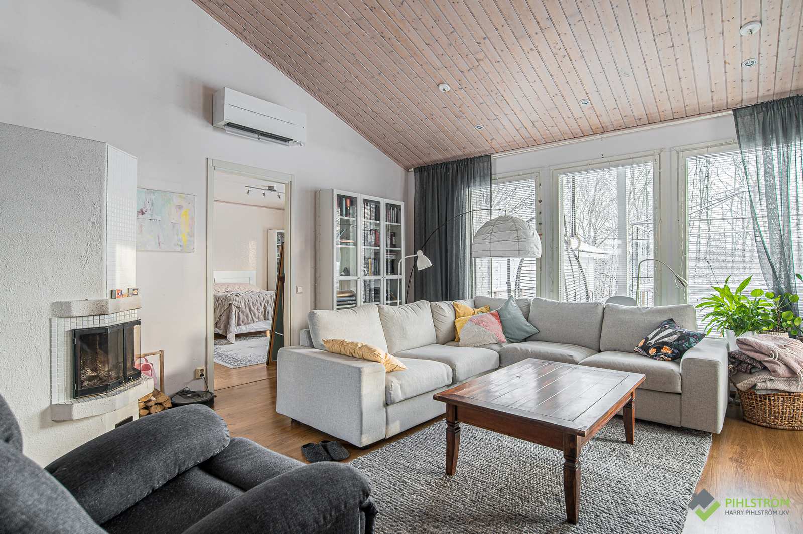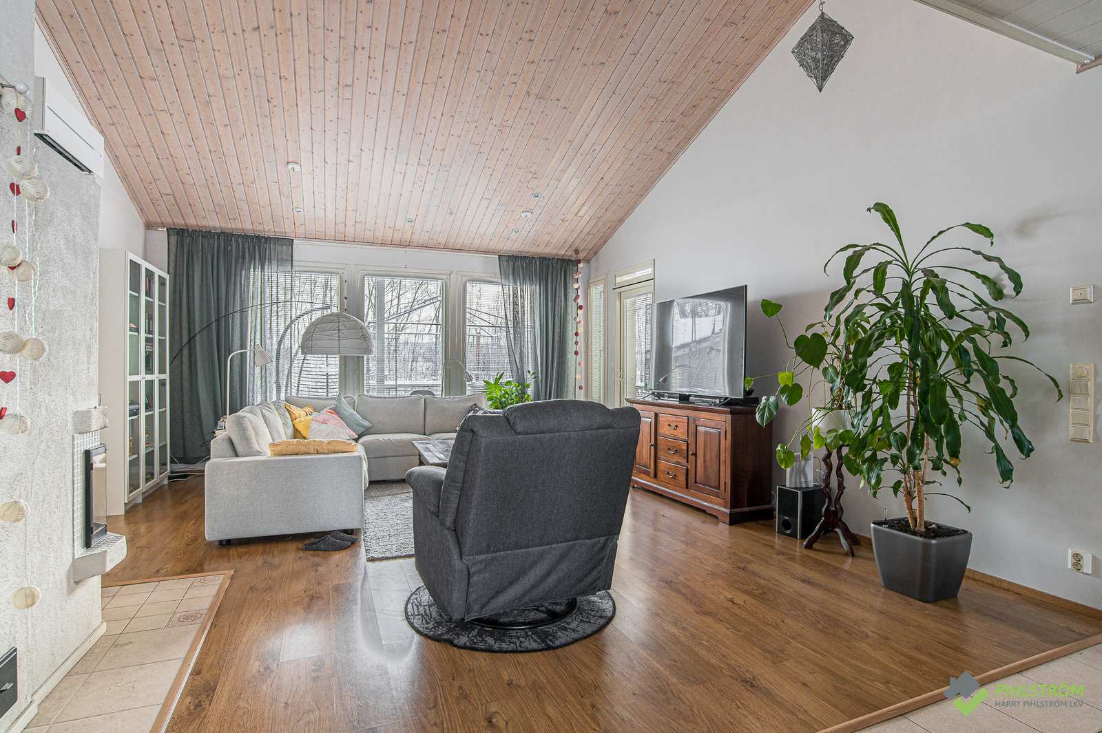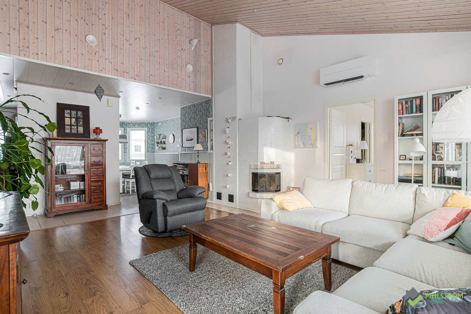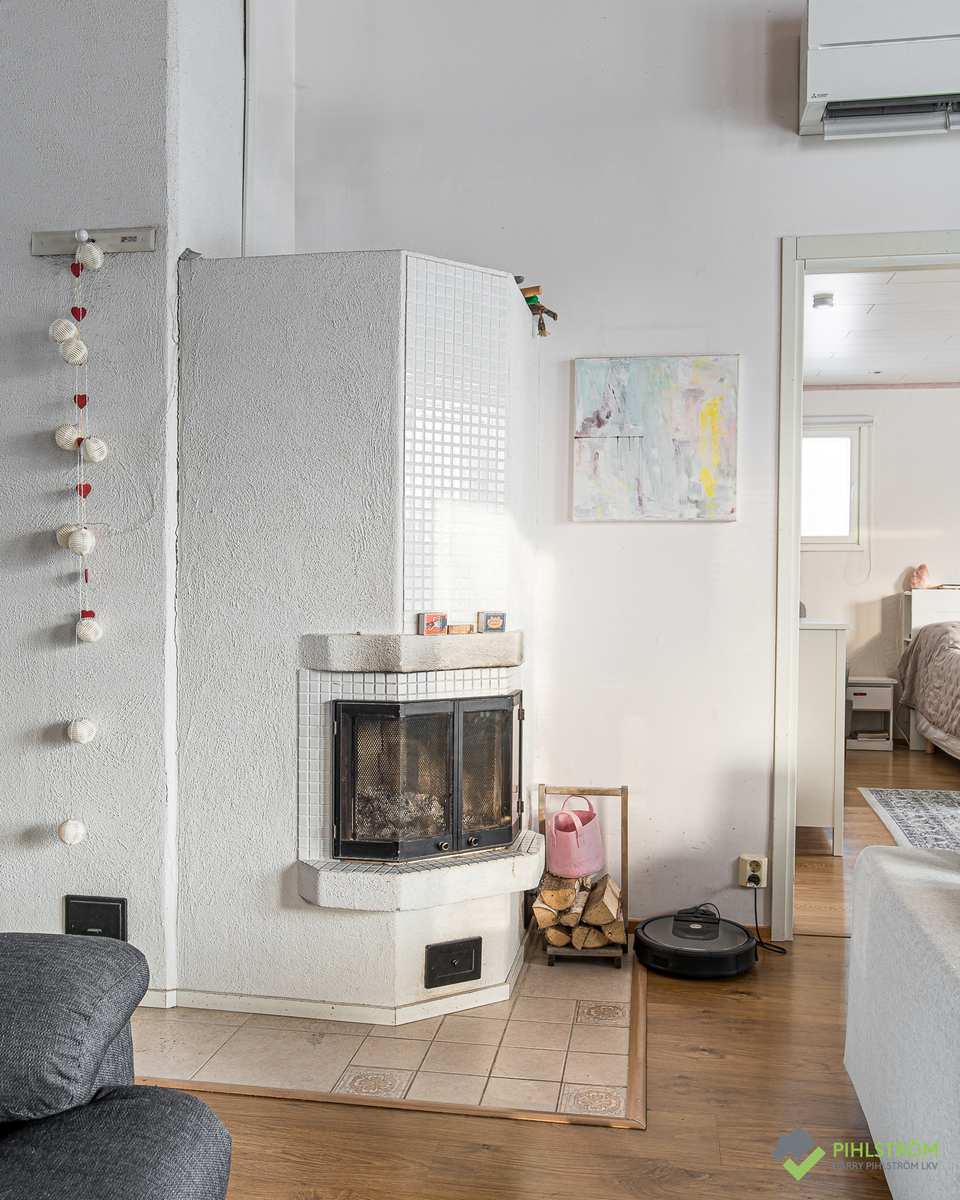 | Olohuone | Hyvän kokoinen olohuone, korkea, viistokattoinen tila, varaava takka ja käynti myös takapihan terassille. Seinät: maalattu Lattia: laminaatti |
