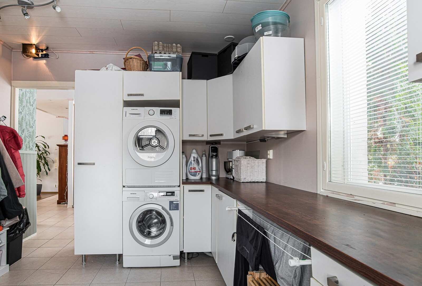 | Kodinhoitohuone | Seinät: maalattu Varusteet: pesukoneliitäntä, lattialämmitys Lattia: laatta |