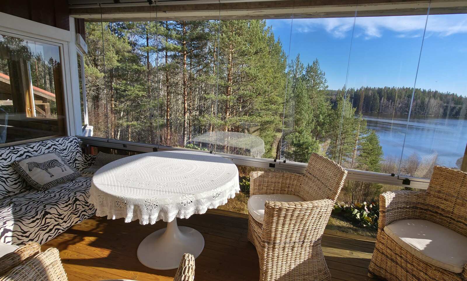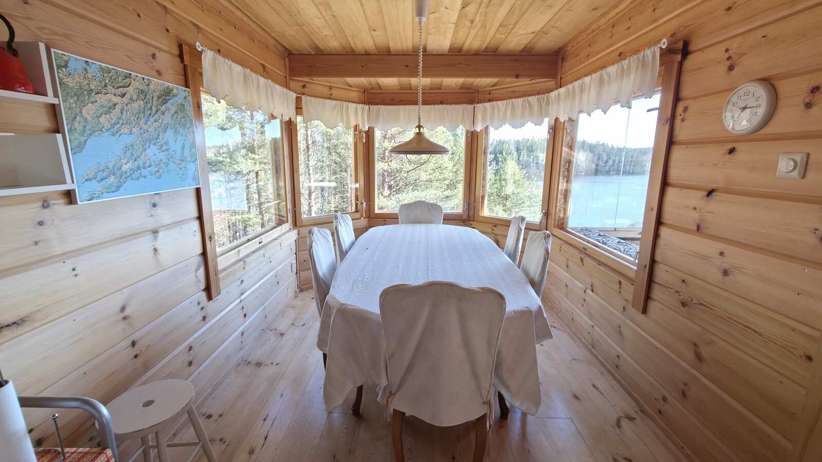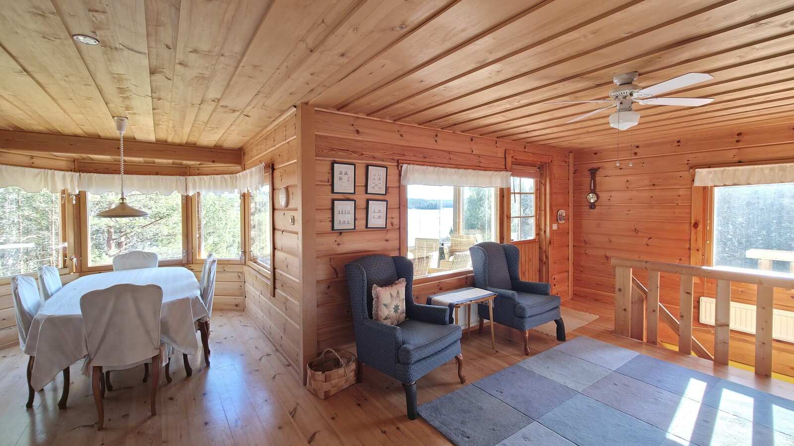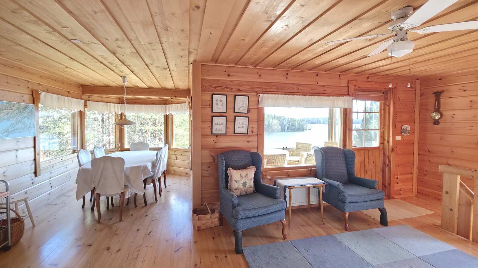 | Olohuone | Avara olohuone-keittiö-ruokailutila -kokonaisuus. Olohuoneesta käynti myös lasitetulle parvekkeelle, josta kaunis järvinäkymä. Seinät: puu Lattia: lauta |