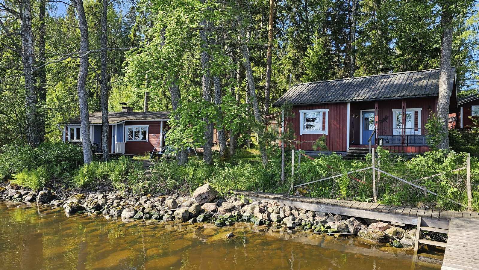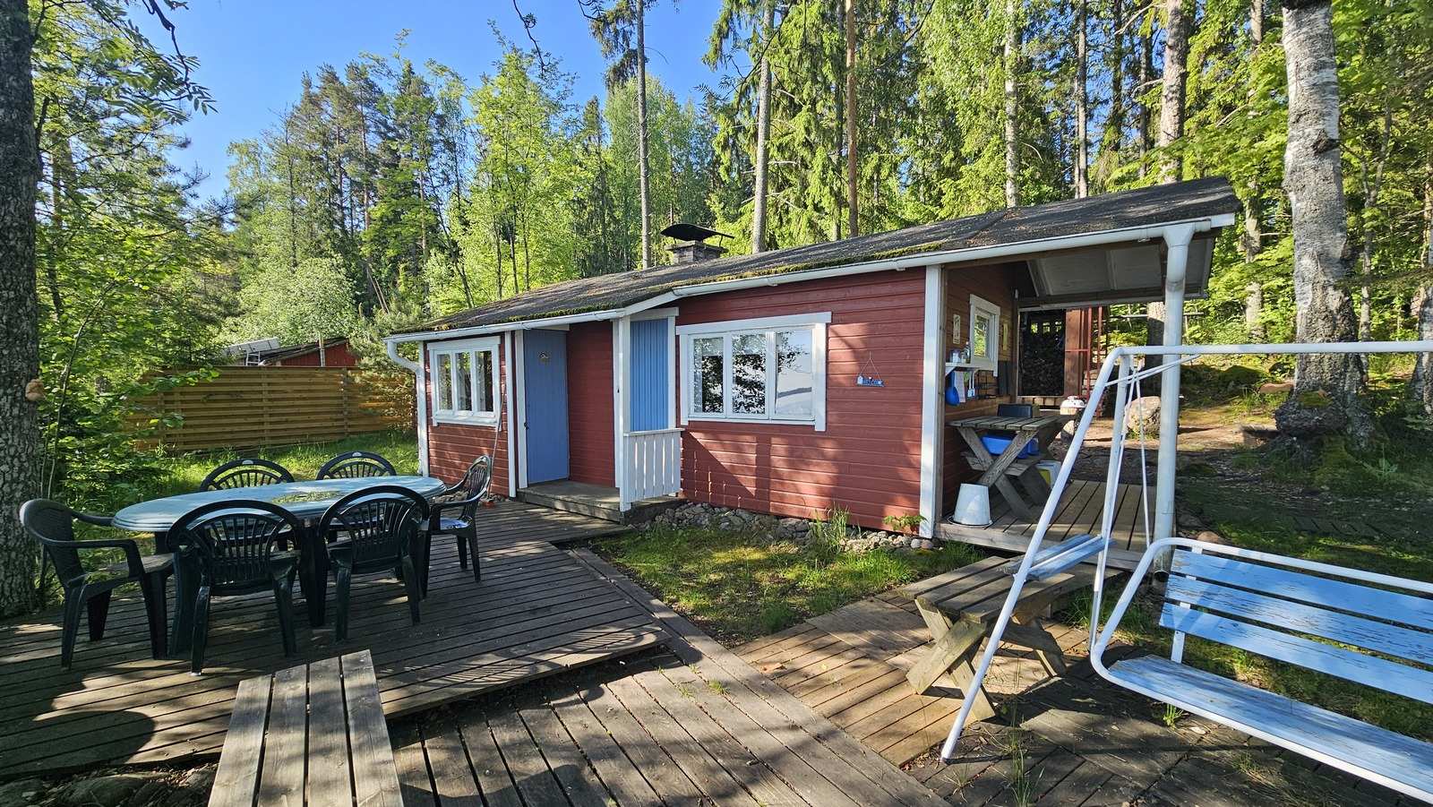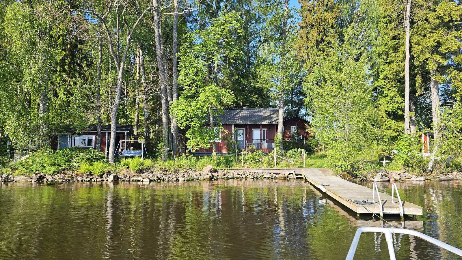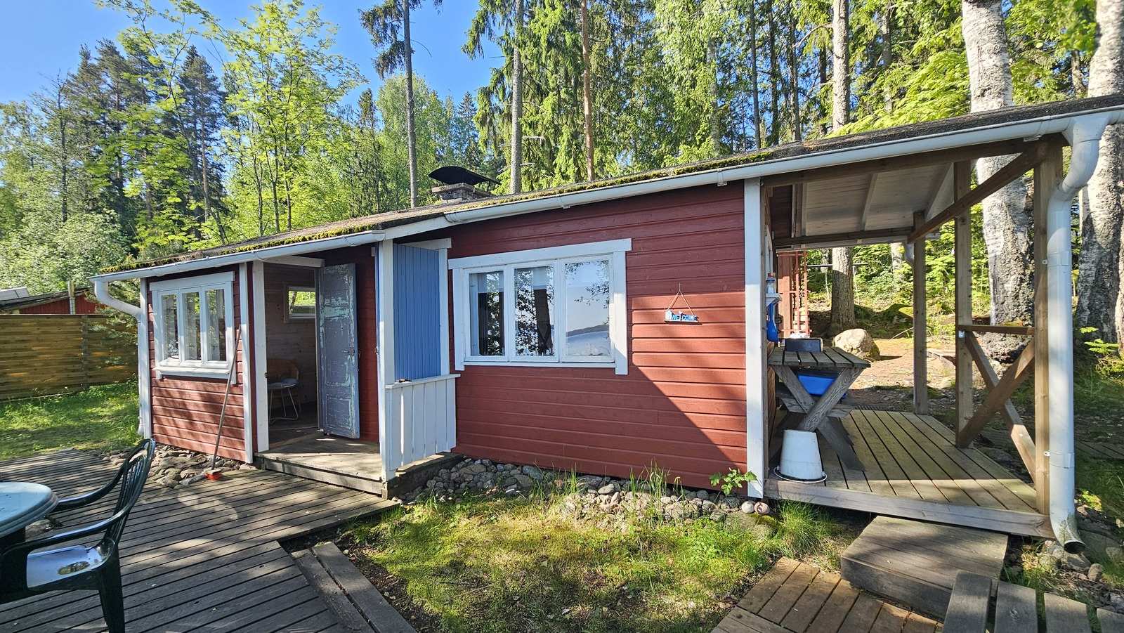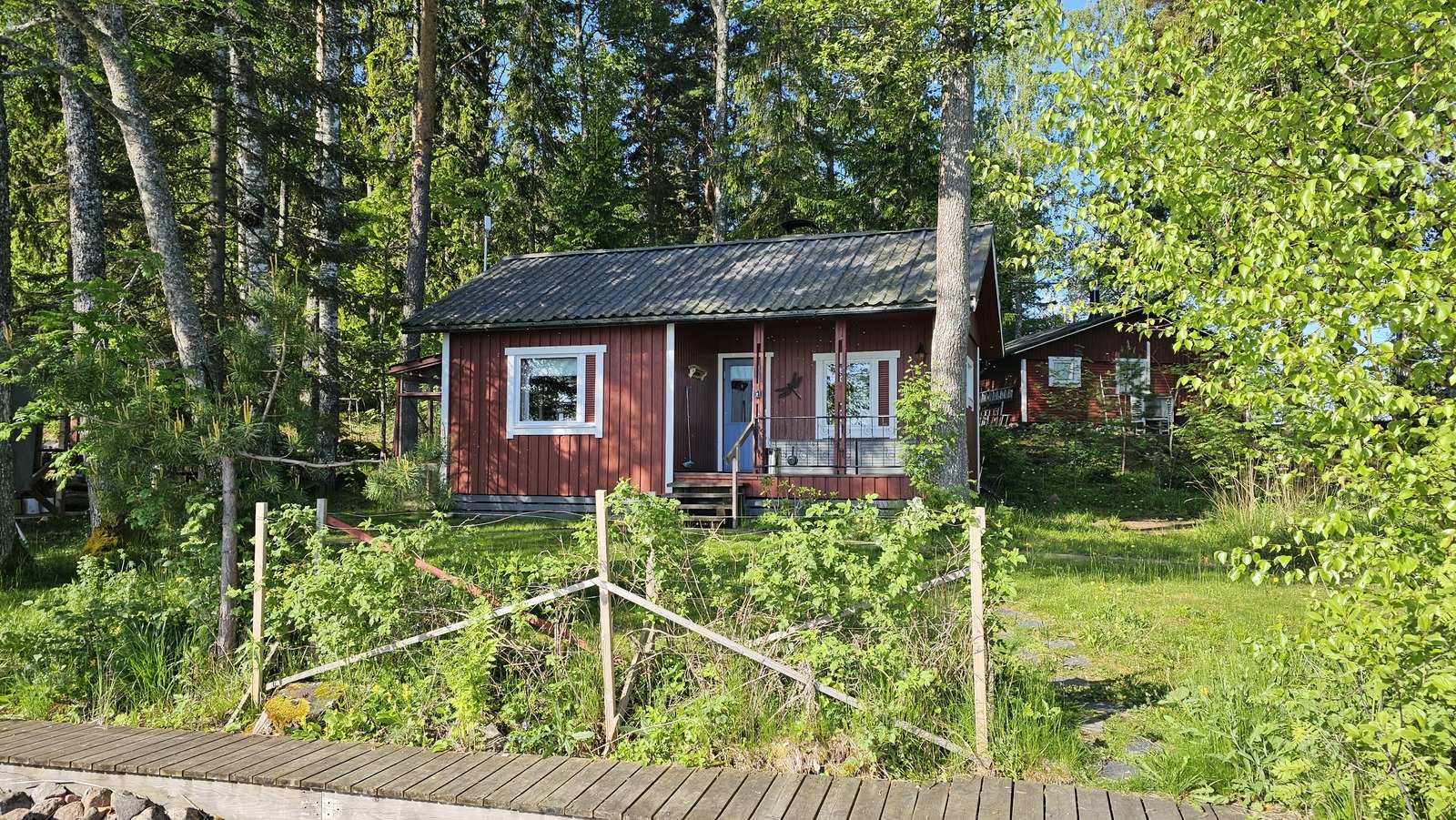 Tasainen tontti 1130m2, jolla omaa rantaa noin 60 metriä. Siistit rakennukset, 1997 rakennettu mökki n. 32m2 (tupak + mh) sekä vanhempi saunarakennus, jossa sauna, pukuhuone ja 1h n. 20m2. Lähes kaikki irtaimisto kuuluu kauppaan. Huom! Tämä on saarimökki, johon kuljetaan veneellä.
