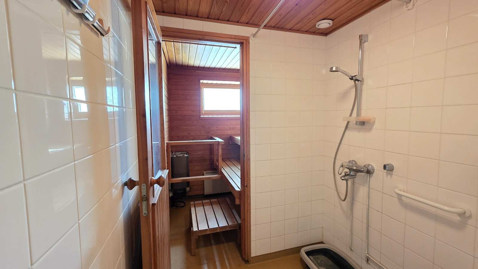 | Saunan pinnat | Seinät: puu Lattia: muovi |