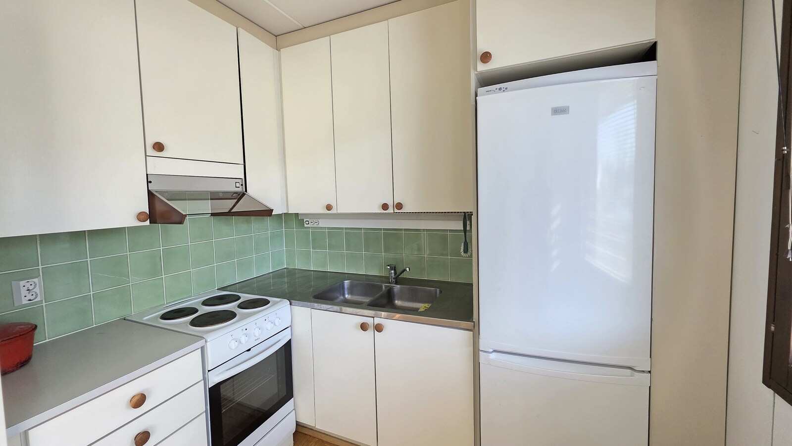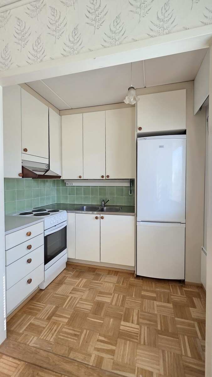 | Keittiön varustus | Jääkaappi ja pakastin: jääkaappi/pakastin Muut varusteet: liesikupu Seinät: maalattu Lattia: parketti Liesi/uuni: keraaminen |