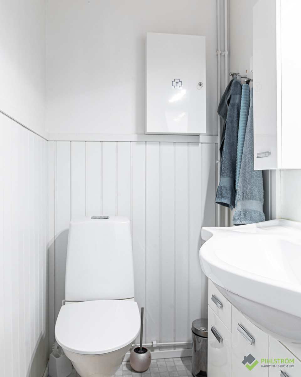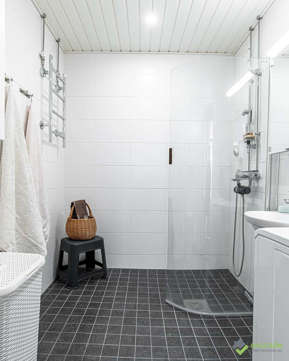 | Kylpyhuone | Varusteet: suihkuseinä, pesukoneliitäntä, peilikaappi, kylpyhuonekaapisto Seinät: kaakeli Lattia: laatta |