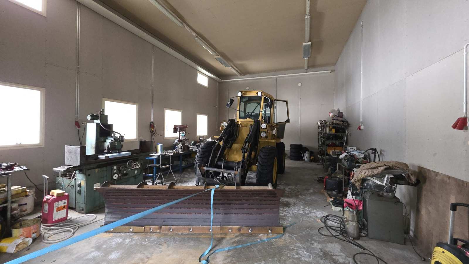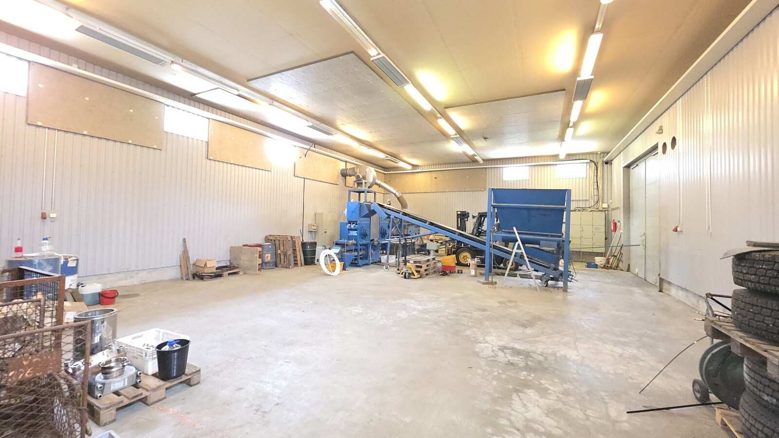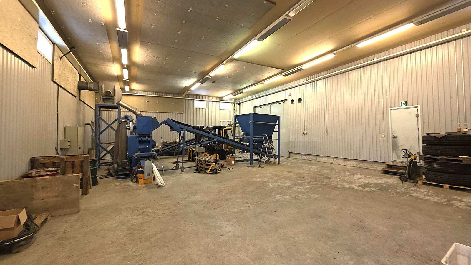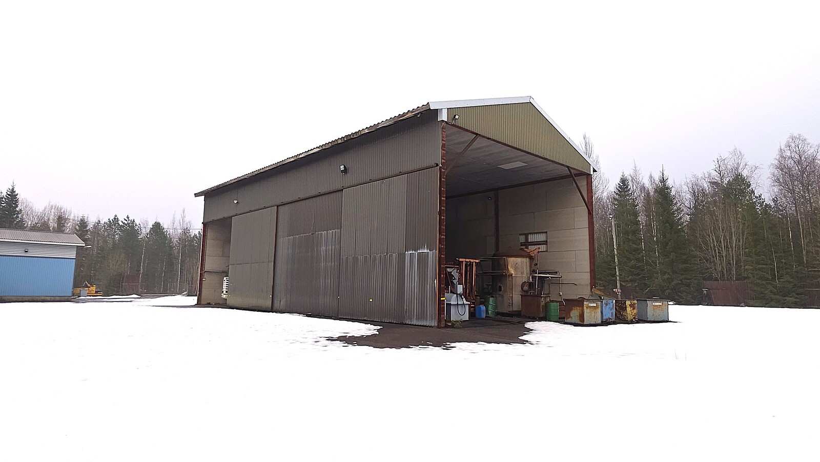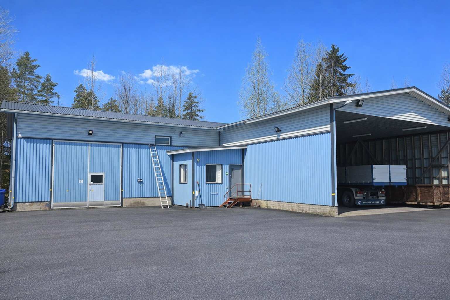 noin 2003 rakennettu hallirakennus 456 m2 (josta n. 300m2 lämmintä hallitilaa ja 150m2 katosta) sekä lisäksi noin 300m2 katosrakennus isolla asfaltoidulla ja aidatulla piha-alueella.