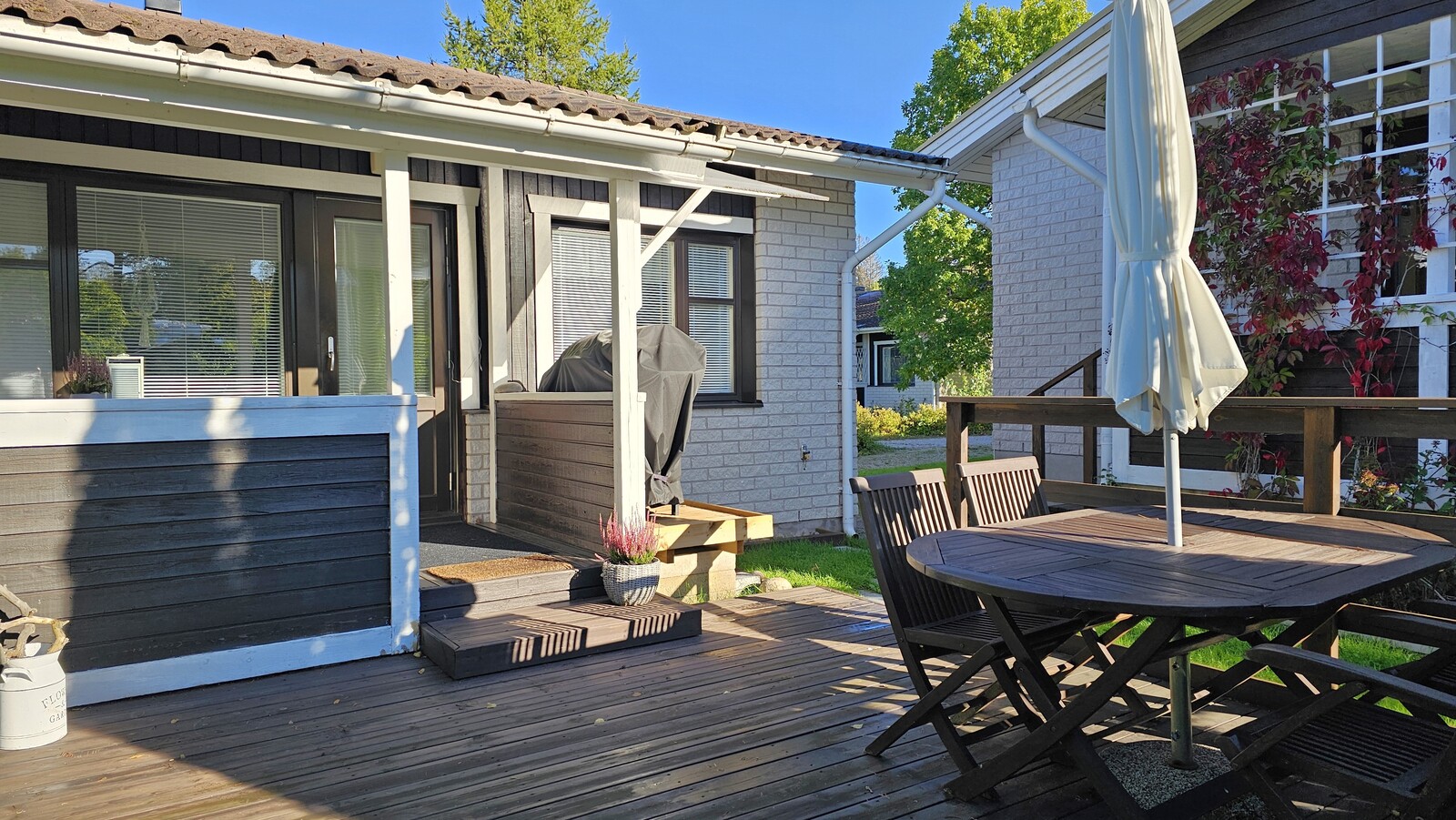 Kiva oma takapiha terasseineen, ulkovarasto huoneiston edessä sekä autokatospaikka.