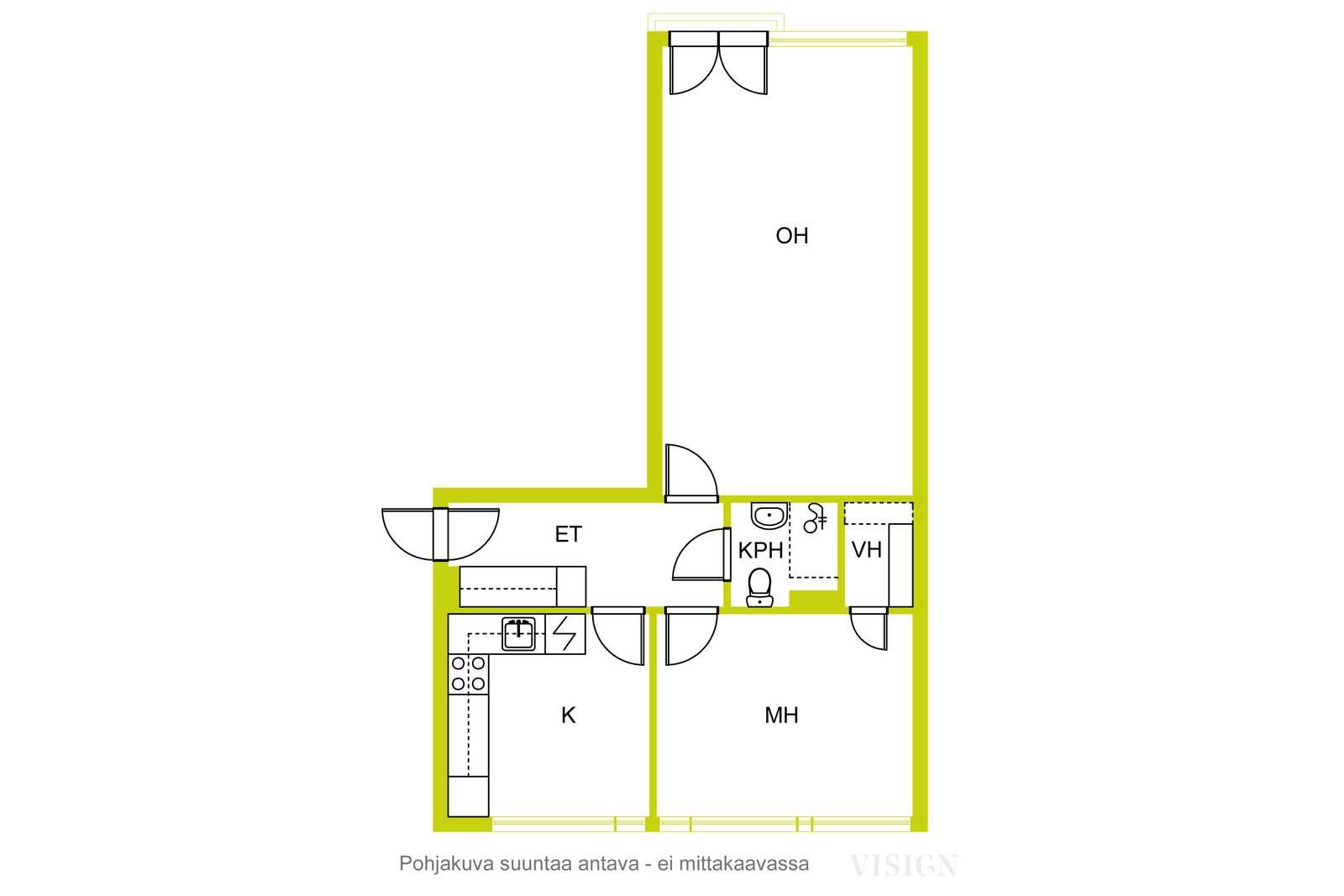 | Keittiön varustus | Seinät: maalattu, tapetti Lattia: muovi Liesi/uuni: sähköliesi |