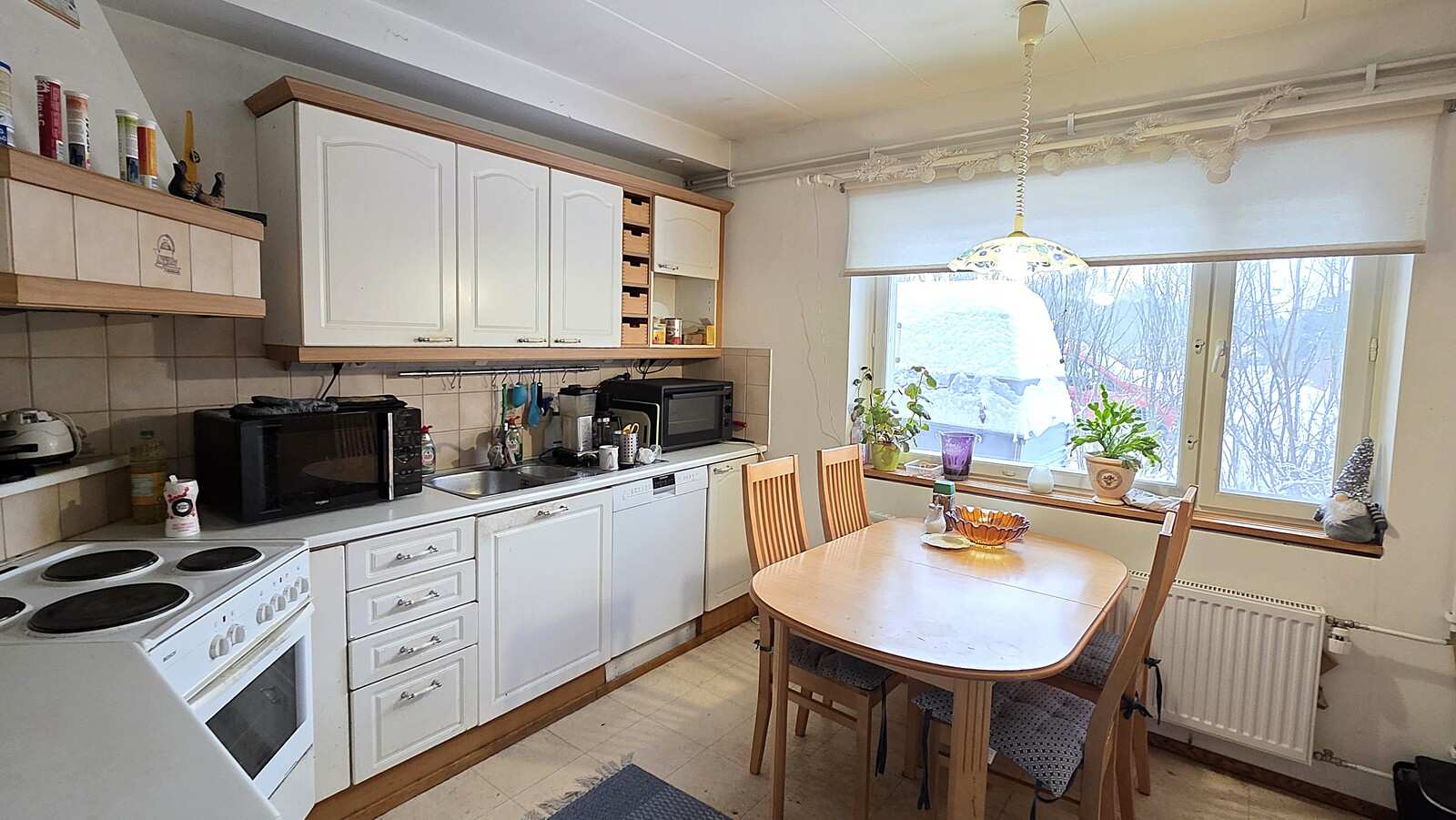 | Keittiön varustus | Jääkaappi ja pakastin: jääkaappi/pakastin Muut varusteet: liesituuletin, astianpesukone Seinät: maalattu Lattia: muovi Liesi/uuni: sähköliesi |