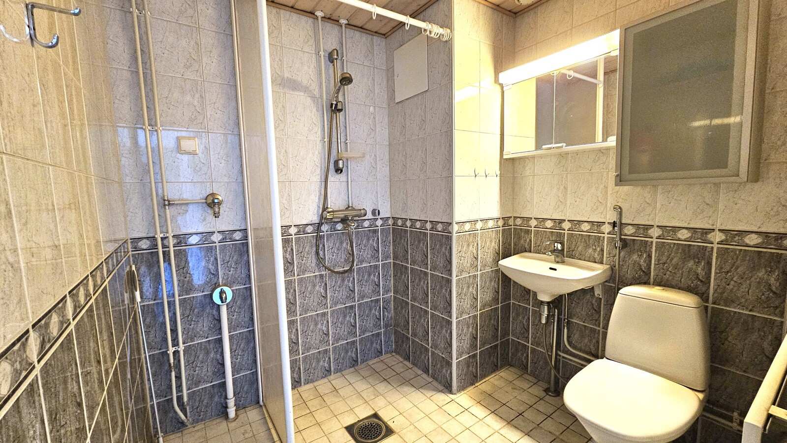 | Kylpyhuone | Lattia: laatta Varusteet: pesukoneliitäntä, wc-istuin, suihku Seinät: kaakeli |