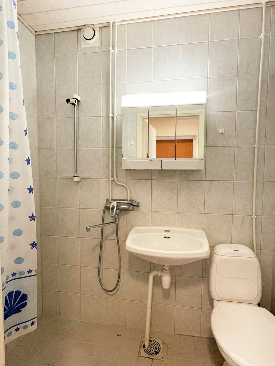 | Kylpyhuone | Lattia: laatta Varusteet: pesukoneliitäntä, wc-istuin, suihku Seinät: kaakeli |
